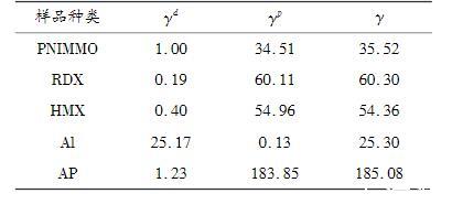 将表1中的接触角测试结果代入式(2)中,利用Owens——Wendt——RabelandKaelble(OWRK)拟合得到PNIMMO及推进剂组分的表面张力,如表2所示。5种样品的表面张力大小顺序为:γ(AP)>γ(RDX)>γ(HMX)>γ(PNIMMO)>γ(Al),其中PNIMMO、RDX、HMX和AP中表面张力的极性分量γp均远大于色散分量γd,说明其表面张力中极性分量贡献更多;而相反Al粉表面张力中色散分量对其表面张力作主要贡献。一般而言,当粘合剂的表面张力小于推进剂中单质固体组分的表面张力时,粘合剂才能较好地包覆于推进剂表面。PNIMMO的表面张力为35.52mN/m,明显小于RDX、HMX及AP的表面张力,说明PNIMMO比较容易铺展于其他固体物质表面。即PNIMMO对RDX、HMX和AP3种固体组分的包覆效果良好。