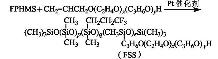 按n(Si-H)∶n(C=C)=1∶1比例将FPHMS和F6以及溶剂异丙醇加入装有搅拌器、回流冷凝管和温度计的四口烧瓶中,通N2,搅拌15 min,然后升温至70——90℃,再滴加氯铂酸醇溶液(以铂计,占总单体质量分数的4.0×10-5),并保温反应4——6 h后,于90℃、60 kPa真空脱低沸物30 min,冷却,得浅褐色至褐色透明液体,即氟硅表面活性剂(FSS),其黏度为850 mPa·s,并溶于冷、热水。反应式为: