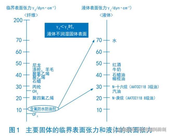 从表面化学分析,要使液体(包括水、油、油性污垢等)不能润湿固体表面纤维,则固体的临界表面张力必须小于液体,也就是θ>90°,液体不能润湿固体表面;反之θ<90°,固体表面被润湿。